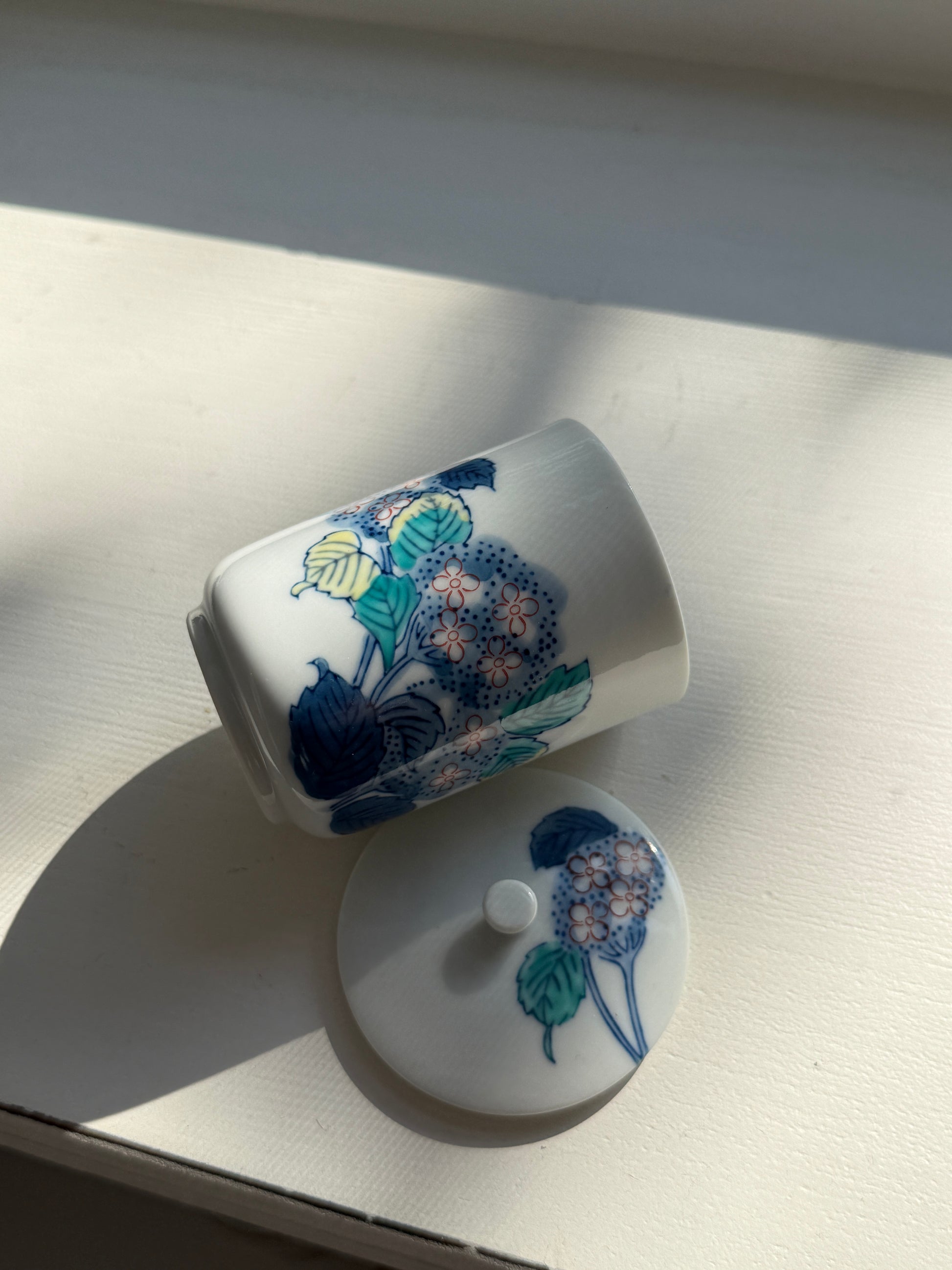 This mini jar & lid has a delicate hydrangea pattern. It's the perfect decor piece for your nightstand or vanity!