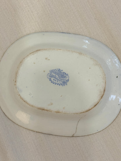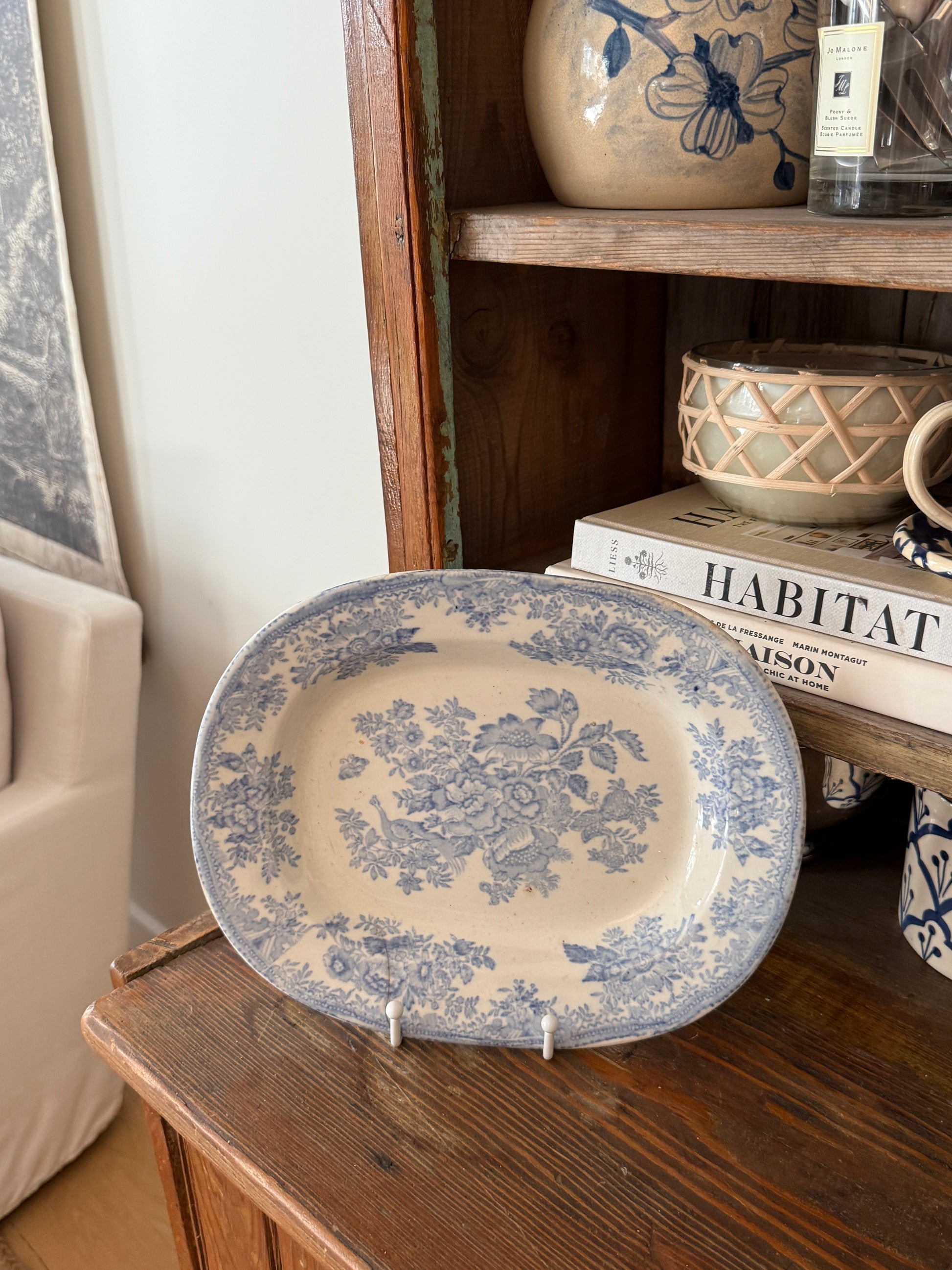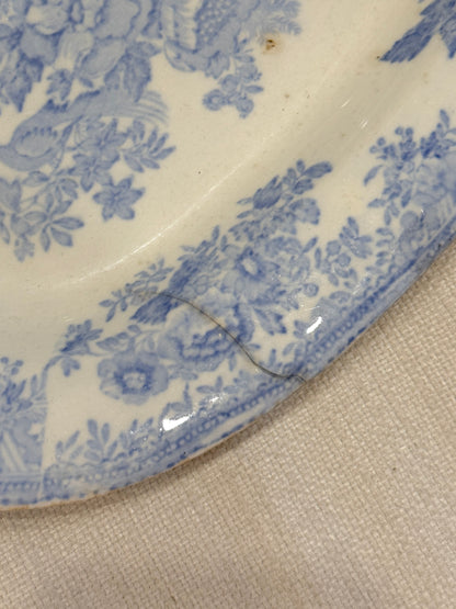 This transferware platter has a delicate blue & white pattern. As an antique piece, it shows its history with chipping on the base and a chip that's been glued back together (as shown in photos)!